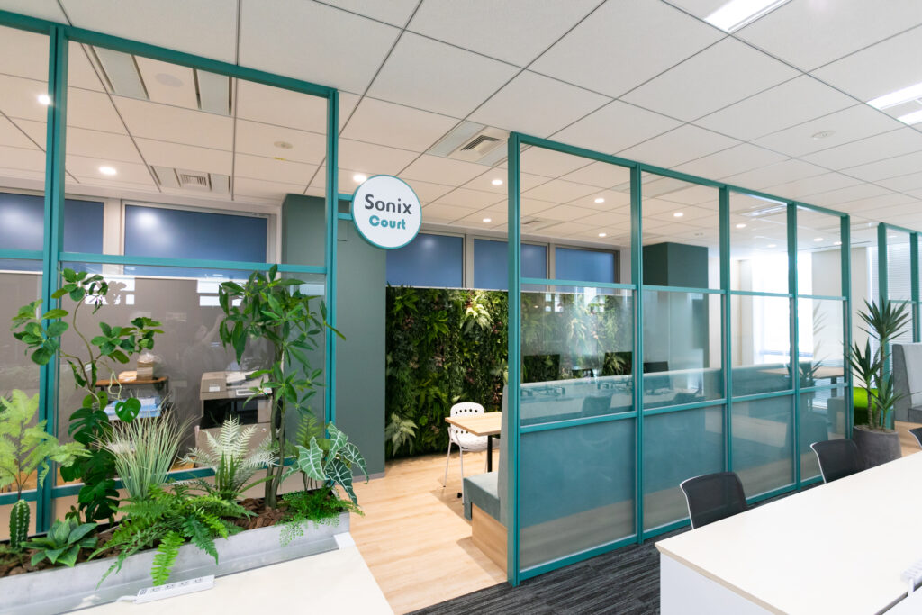 一面のボタニカルウォールが特徴的な休憩スペースは「Sonix Court」と名付けられました。こちらでコーヒーを飲んだり、休憩時間に集まりカードゲームをする姿も!早くも社員の憩いの場所として定着しています。