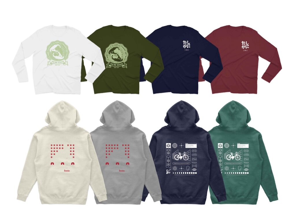 ソニックスアパレル第4弾。秋冬ロングTシャツ&パーカが完成し、22年末にクリスマスプレゼントとして社員に配布されました。ロングTシャツとパーカで全8種類で、デザインは弊社デザイングループが担当しました。社員一同楽しみながら手に取り、改めて結束力を高めることができました。