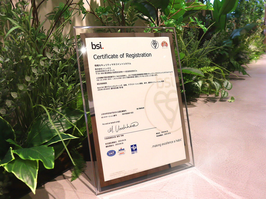 株式会社ソニックスは、2023年4月26日付で情報セキュリティマネジメントシステム(ISMS)の国際規格であるISO/IEC 27001の認証を取得いたしました。
